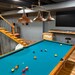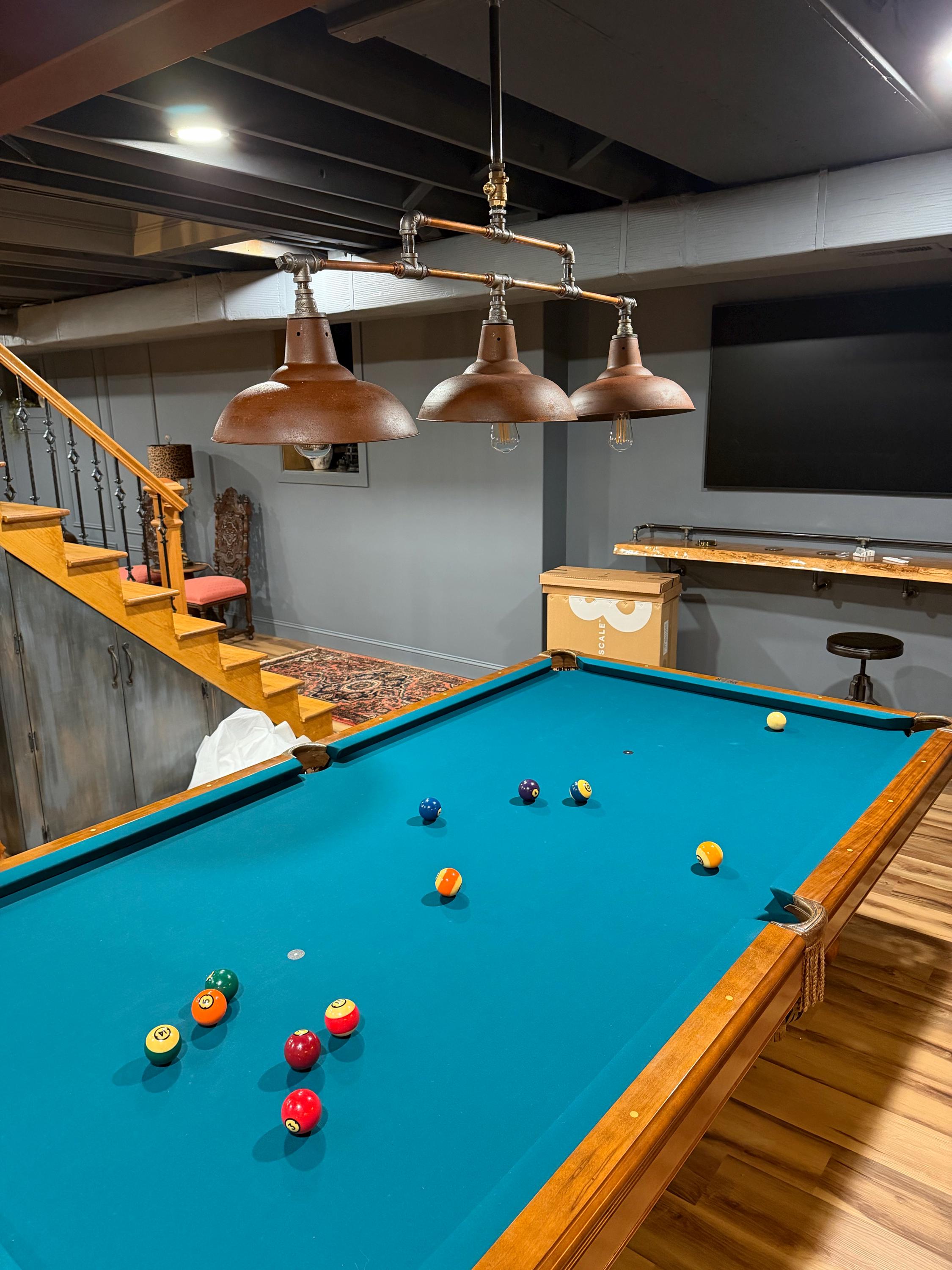 Rustic pool table & dome style lamp shades.